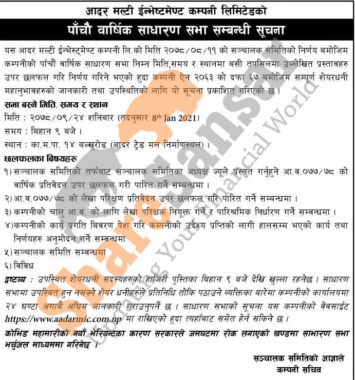 Aadar Multi Investment Company Limited has announced its 5th AGM going to be held on 24th Poush, 2078.