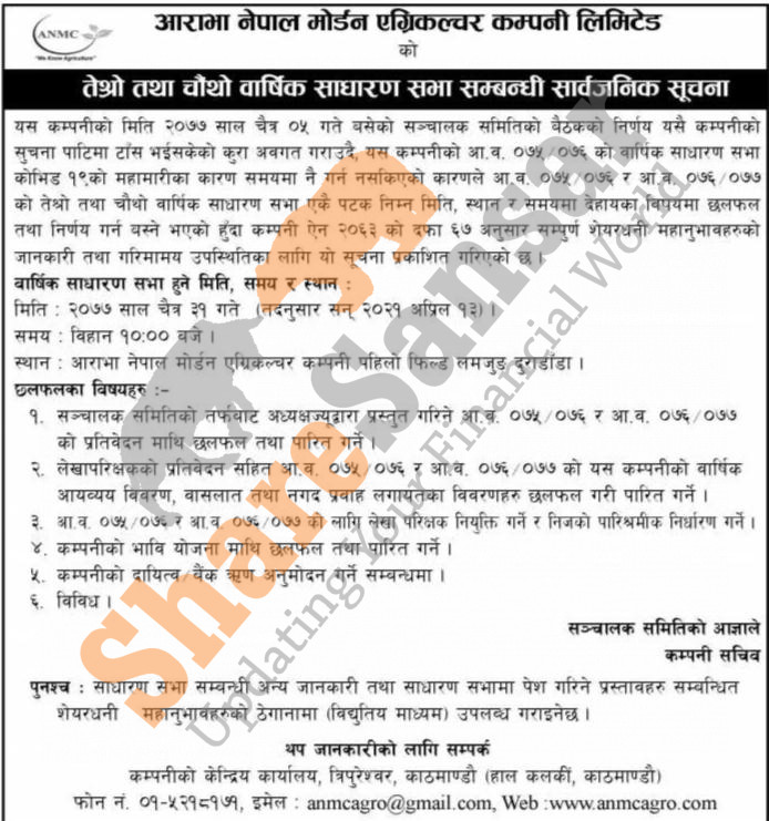 Aarabha Nepal Modern Agriculture Company Limited has announced its 3rd and 4th AGM going to be held on 31st Chaitra, 2077.