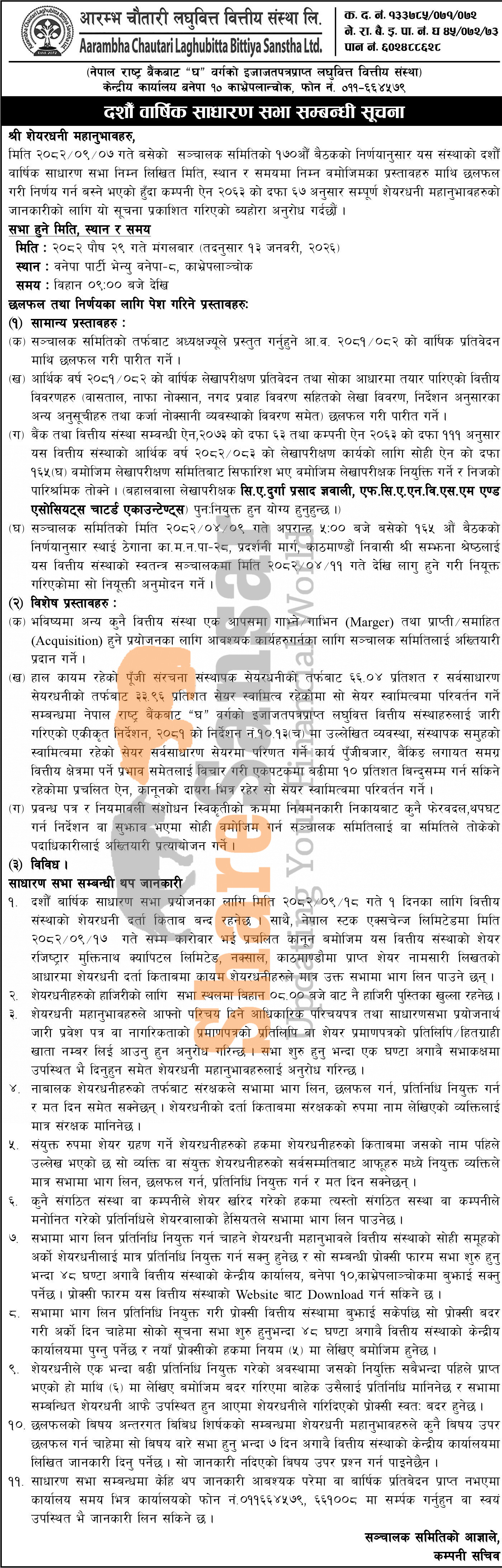 Aarambha Chautari Laghubitta Bittiya Sanstha Limited has announced its 10th AGM going to be held on 29th Poush, 2082.