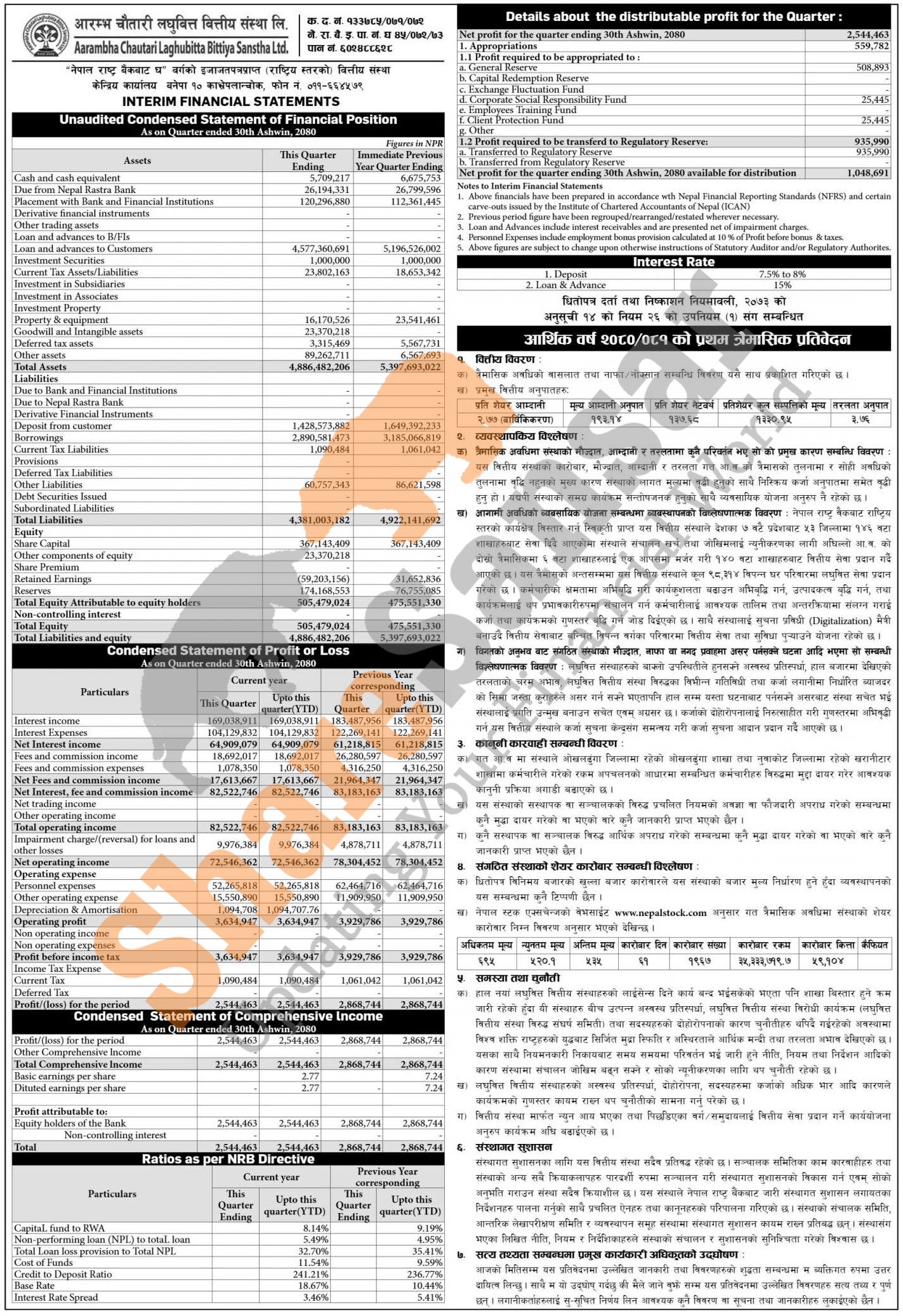 Aarambha Chautari Laghubitta Bittiya Sanstha Limited has posted a net profit of Rs 2.54 million and published its 1st quarter company analysis of the fiscal year 2080/81.