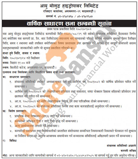 Aayu Molung Hydropower Limited has announced its AGM going to be held on 24th Poush, 2082.