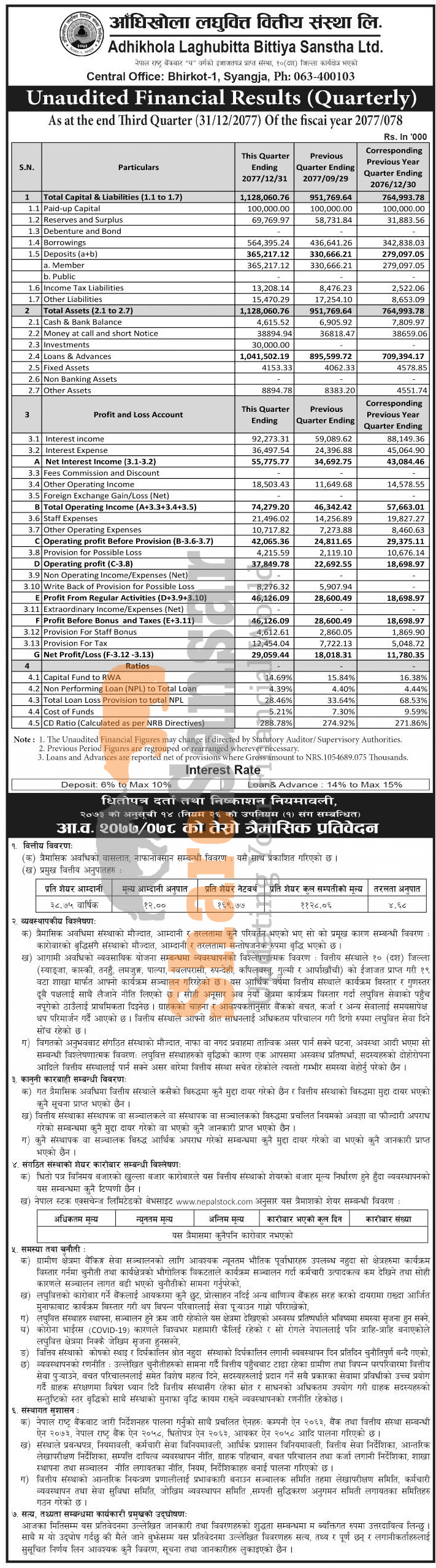 Adhikhola Laghubitta Bittiya Sanstha Limited has posted a net profit of Rs 29.05 million and published its 3rd quarter company analysis of the fiscal year 2077/78.