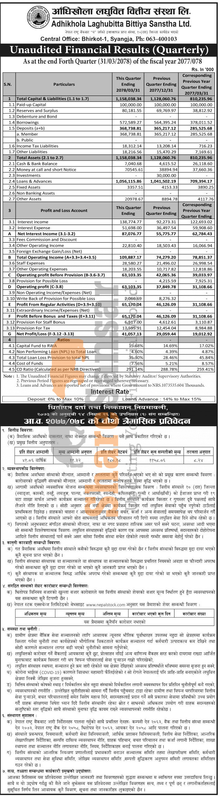Adhikhola Laghubitta Bittiya Sanstha Limited has posted a net profit of Rs 41.05 million and published its 4th quarter company analysis of the fiscal year 2077/78.