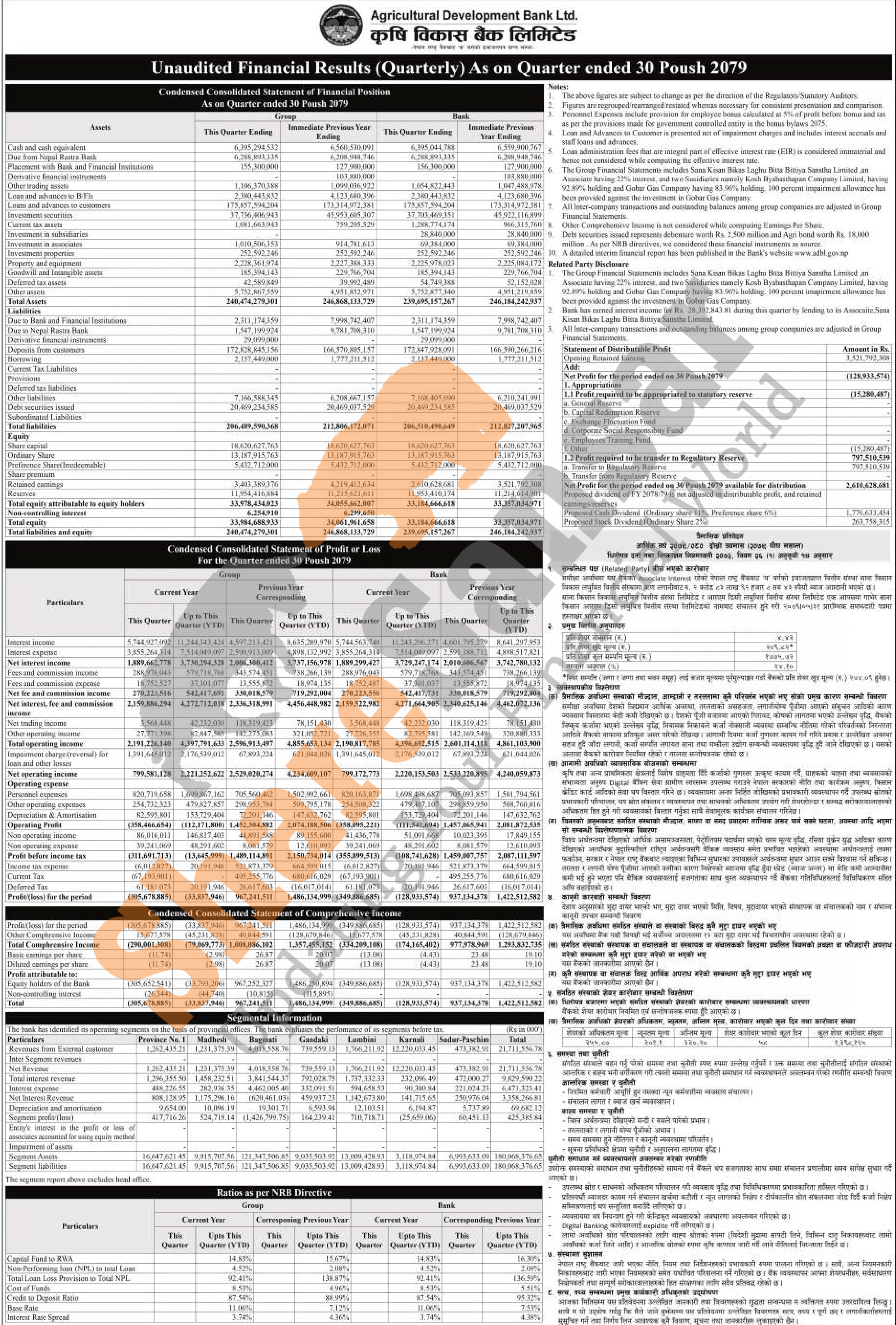 Agricultural Development Bank Limited has posted a net loss of Rs 128.93 million and published its 2nd quarter company analysis of the fiscal year 2079/80.