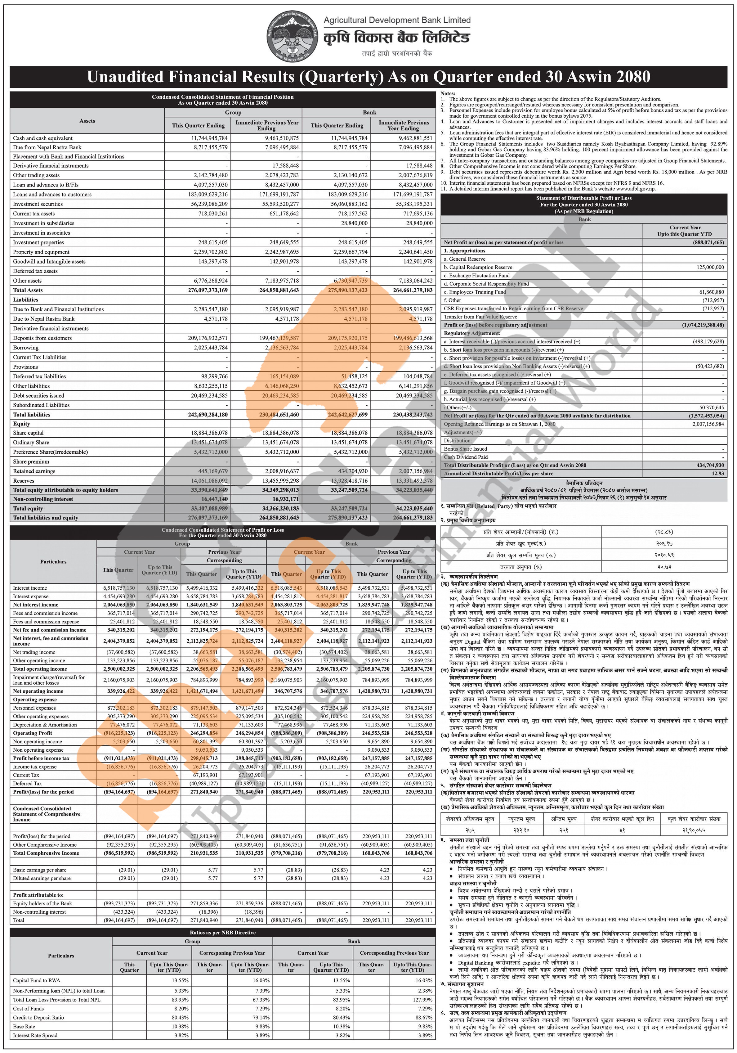 Agricultural Development Bank Limited has posted a net loss of Rs 888.07 million and published its 1st quarter company analysis of the fiscal year 2080/81.
