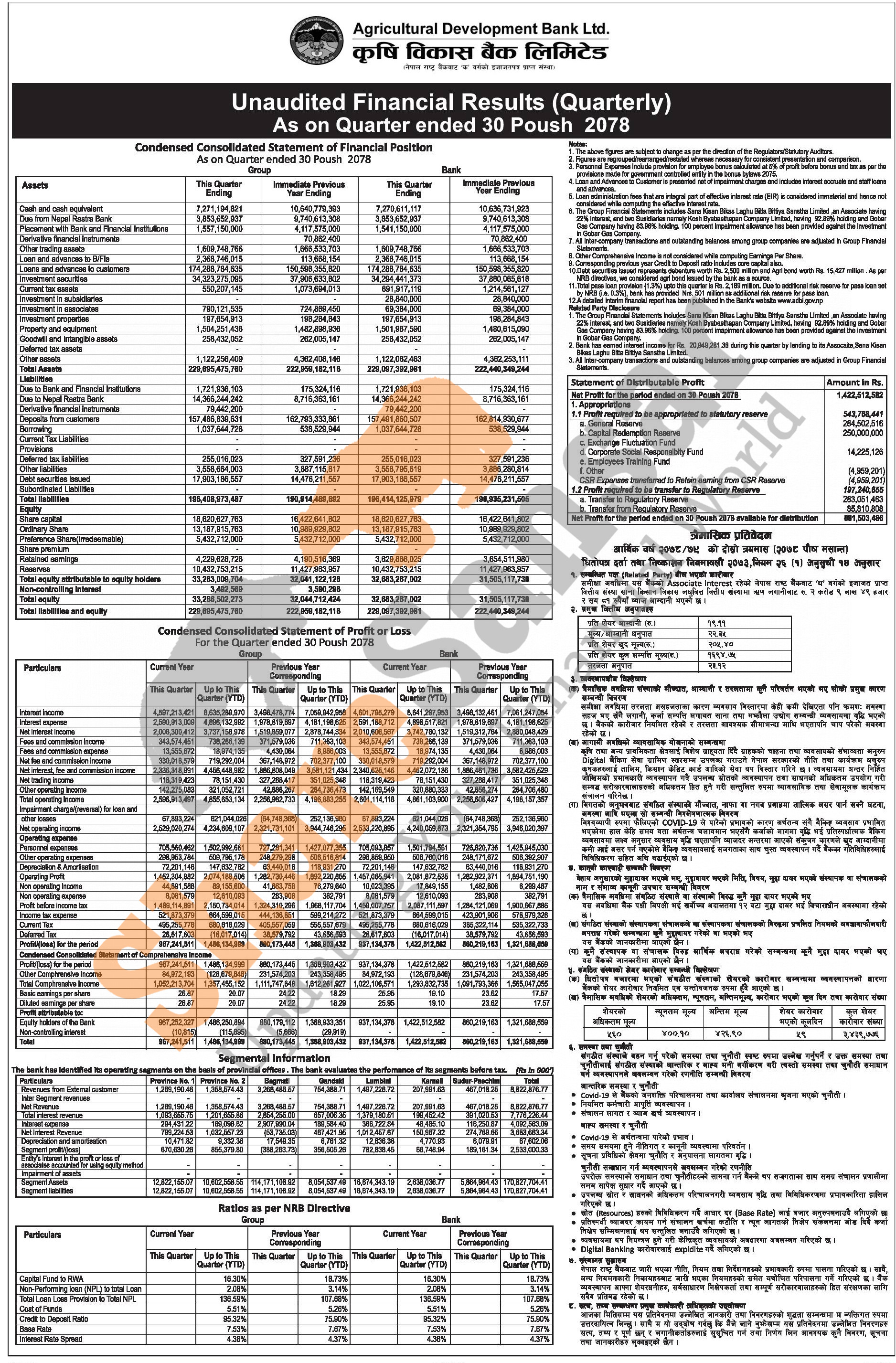 Agricultural Development Bank Limited has posted a net profit of Rs 1.42 billion and published its 2nd quarter company analysis of the fiscal year 2078/79.