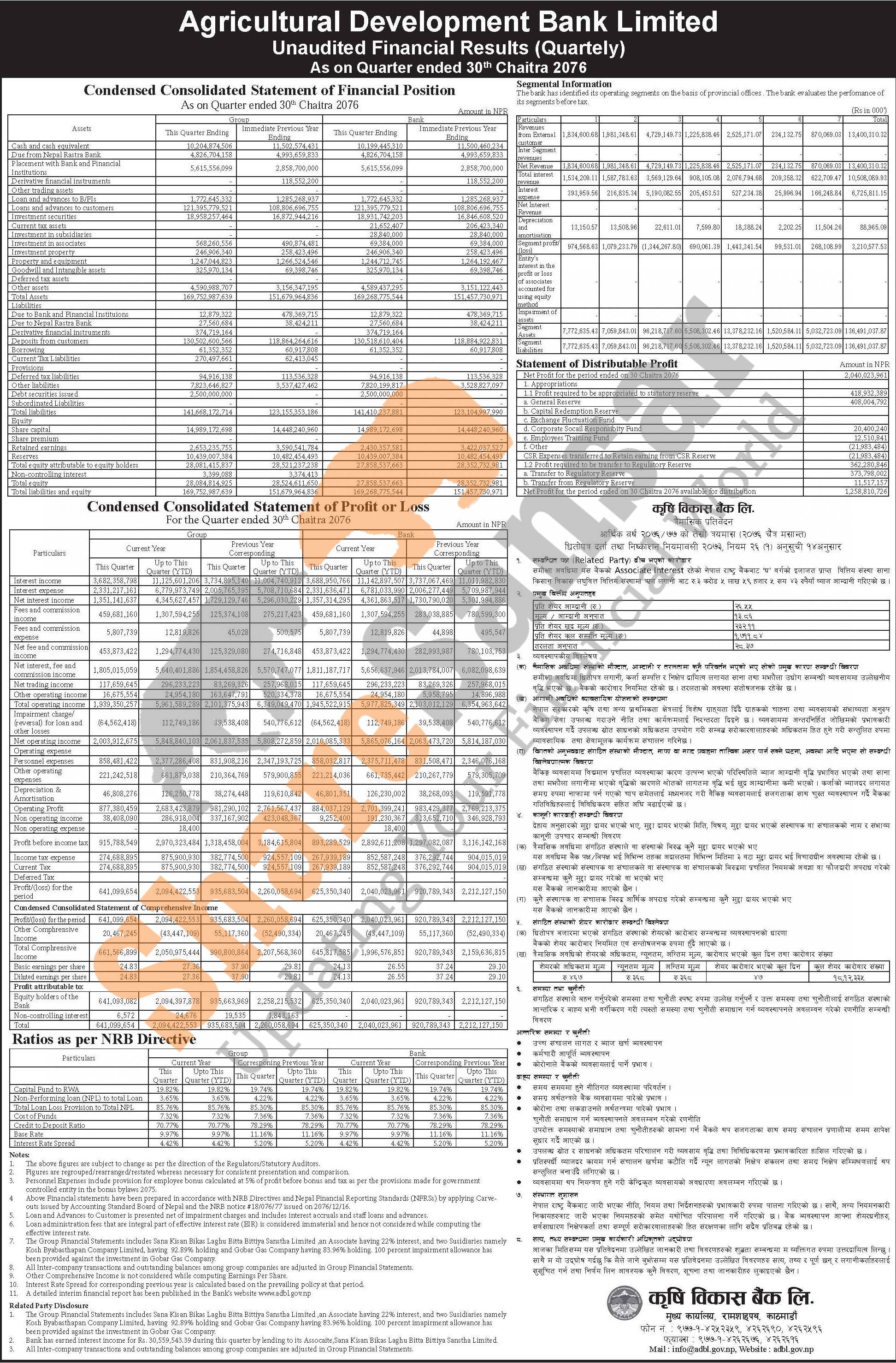 Agricultural Development Bank Limited has posted a net profit of Rs 2.04 billion and published its 3rd quarter company analysis of the fiscal year 2076/77.