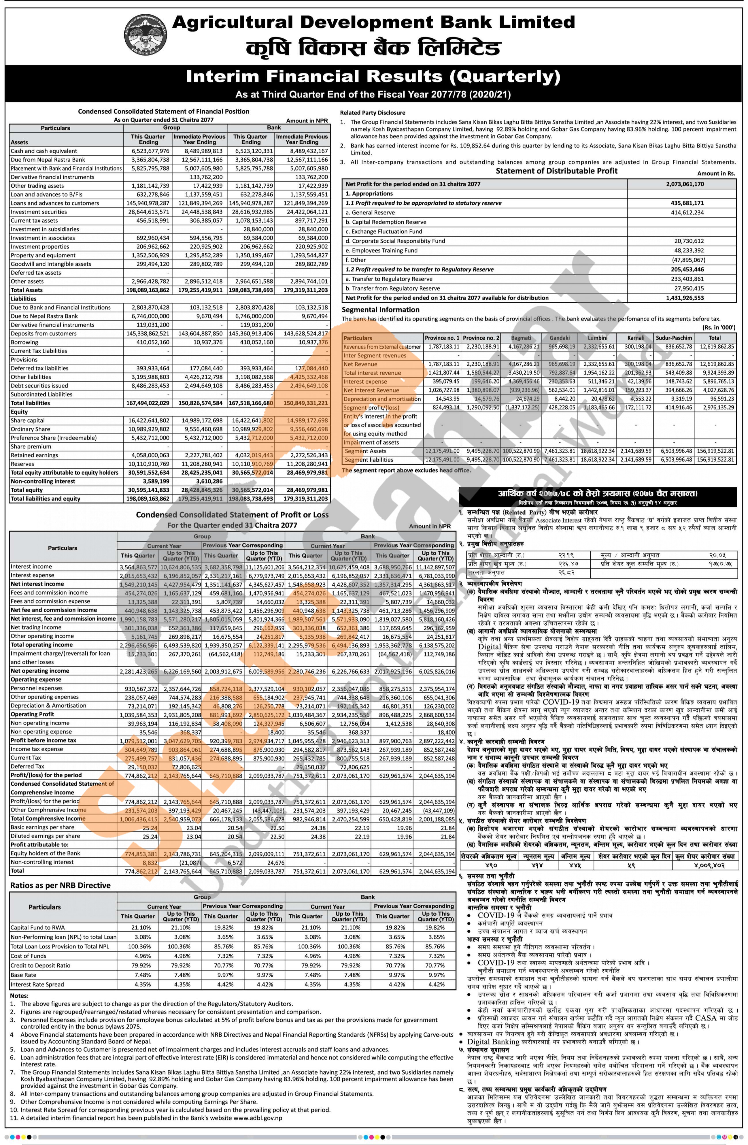 Agricultural Development Bank Limited has posted a net profit of Rs 2.07 billion and published its 3rd quarter company analysis of the fiscal year 2077/78.