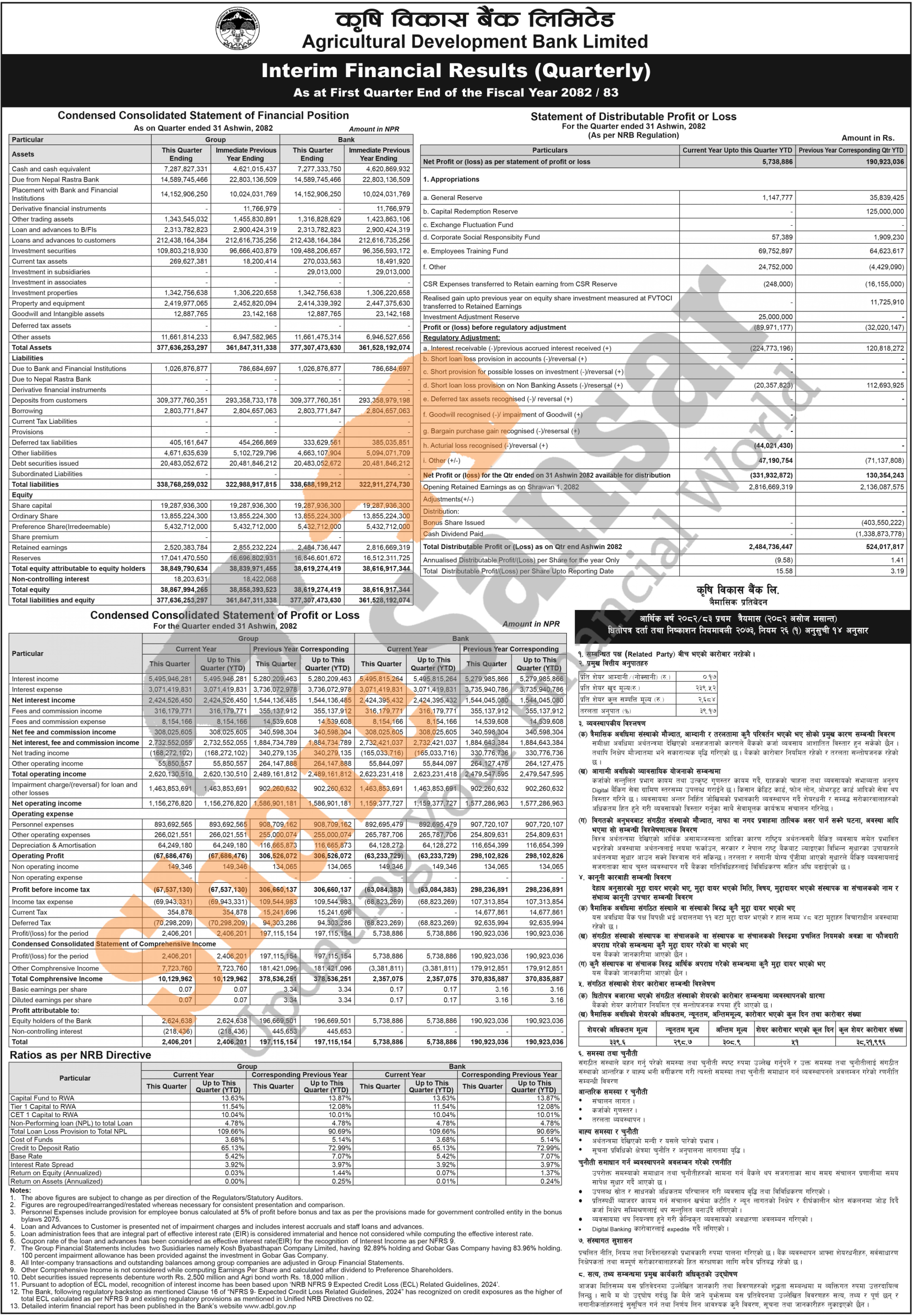 Agricultural Development Bank Limited has posted a net profit of Rs 5.73 million and published its 1st quarter company analysis of the fiscal year 2082/83.