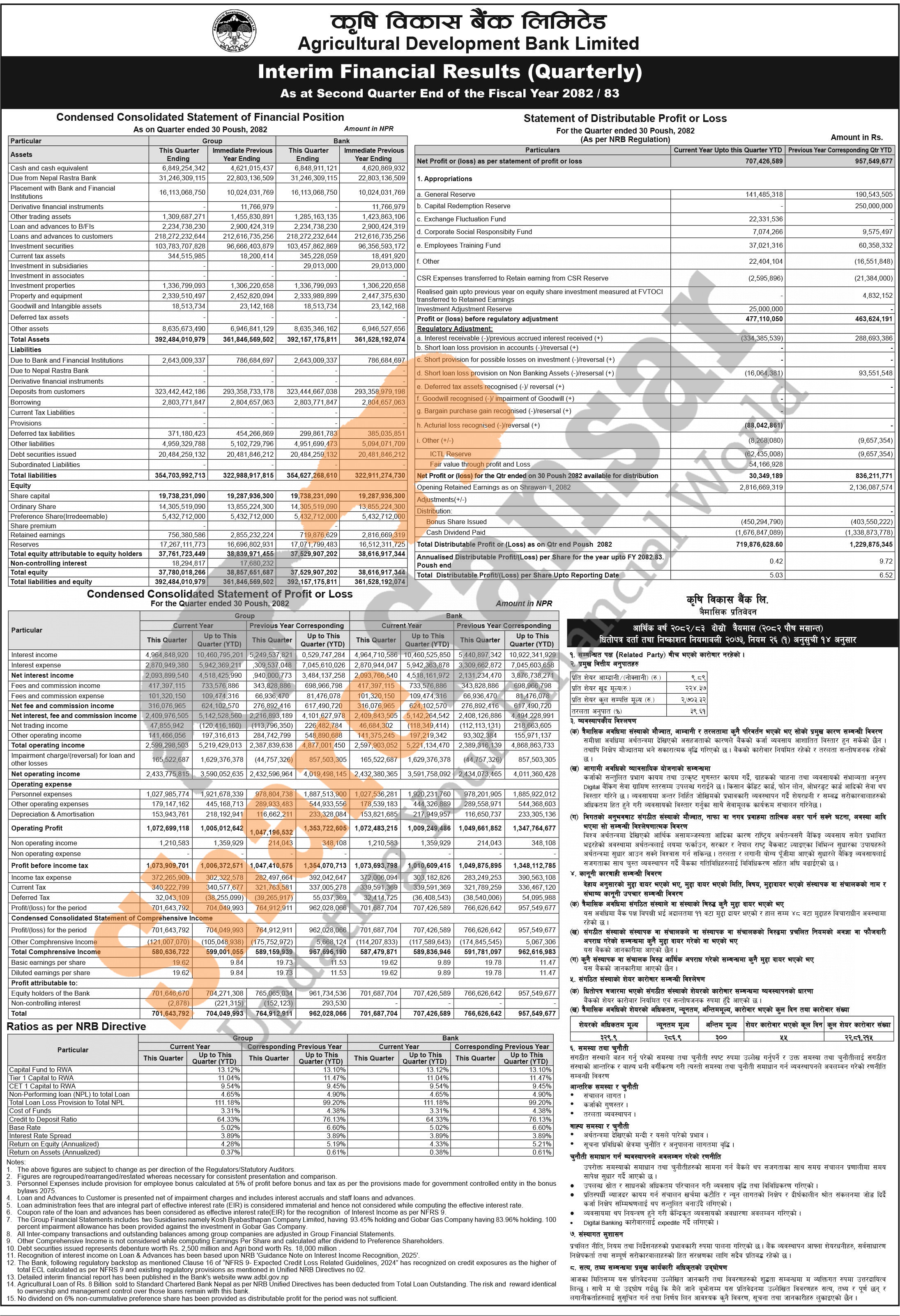 Agricultural Development Bank Limited has posted a net profit of Rs 707.42 million and published its 2nd quarter company analysis of the fiscal year 2082/83.