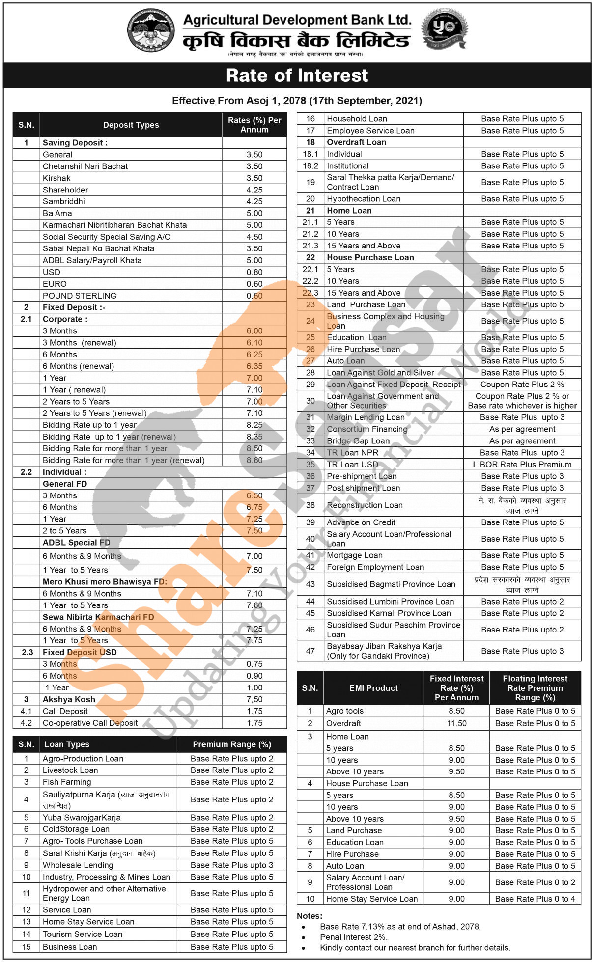 Agricultural Development Bank Limited has published a notice regarding the new interest rate for deposit and loan products and it's effective from 1st Ashwin, 2078.