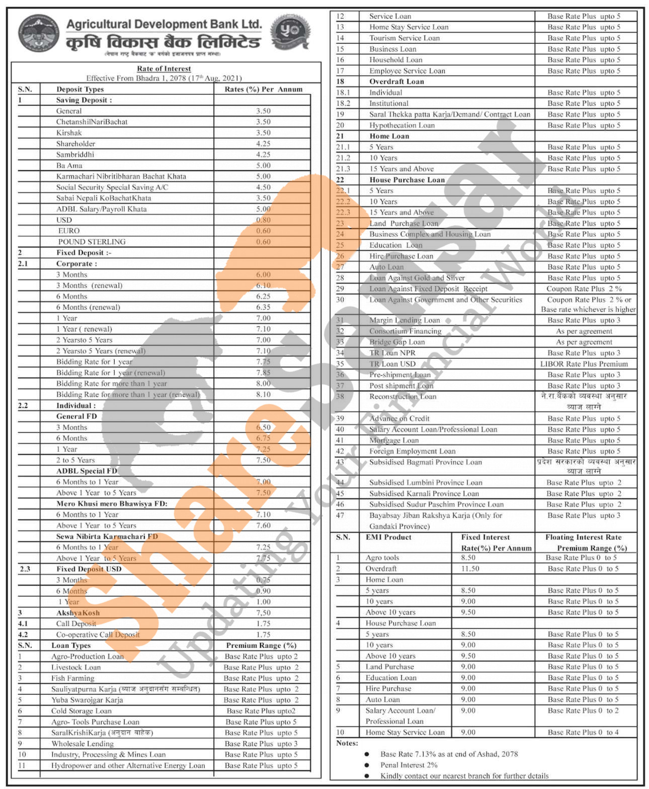 Agricultural Development Bank Limited has published a notice regarding the new interest rate for deposit and loan products and it's effective from 1st Bhadra, 2078.