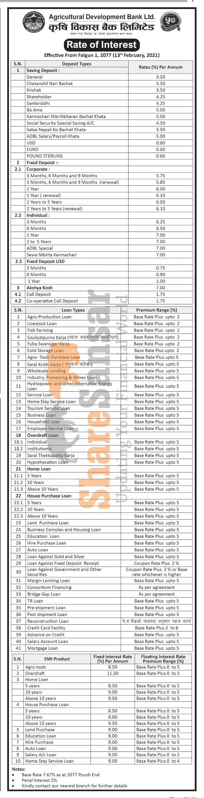 Agricultural Development Bank Limited has published a notice regarding the new interest rate for deposit and loan products and it's effective from 1st Falgun, 2077.
