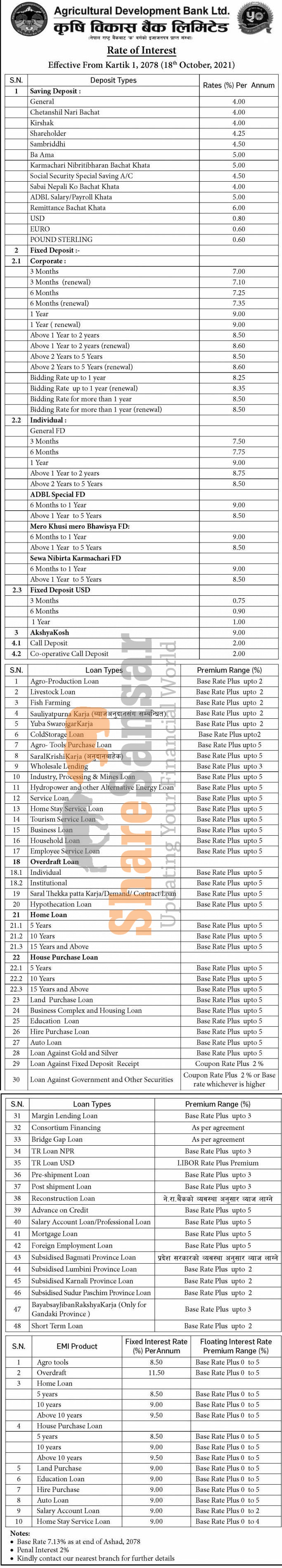 Agricultural Development Bank Limited has published a notice regarding the new interest rate for deposit and loan products and it's effective from 1st Kartik, 2078.