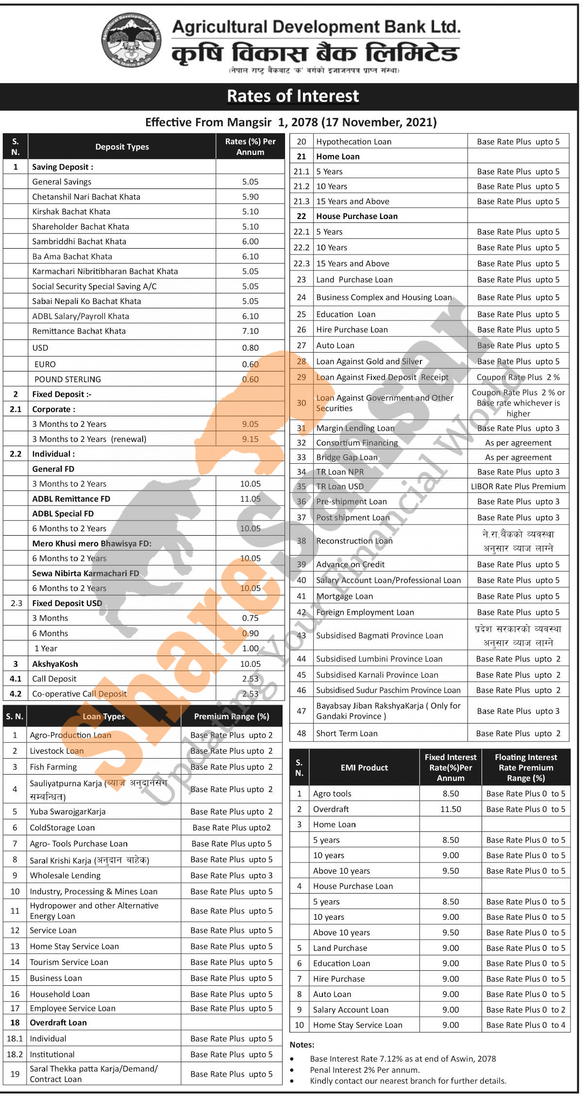 Agricultural Development Bank Limited has published a notice regarding the new interest rate for deposit and loan products and it's effective from 1st Mangshir, 2078.