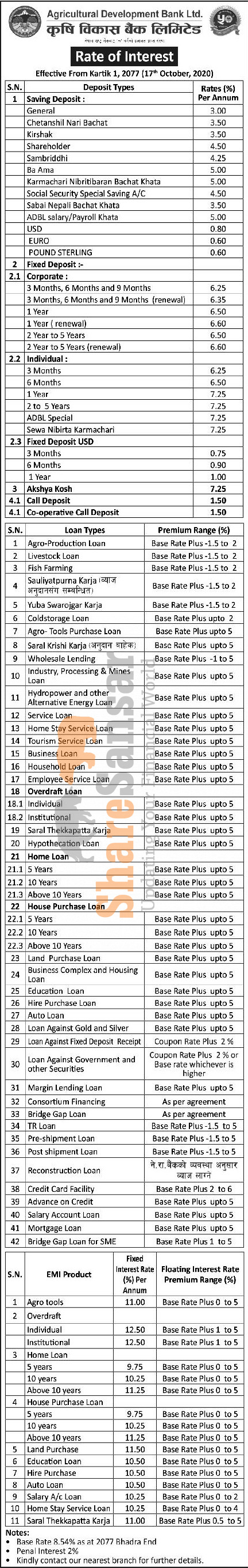 Agricultural Development Bank Limited has published a notice regarding the new interest rate for its loan and deposit products and it's effective from 1st Kartik, 2077.
