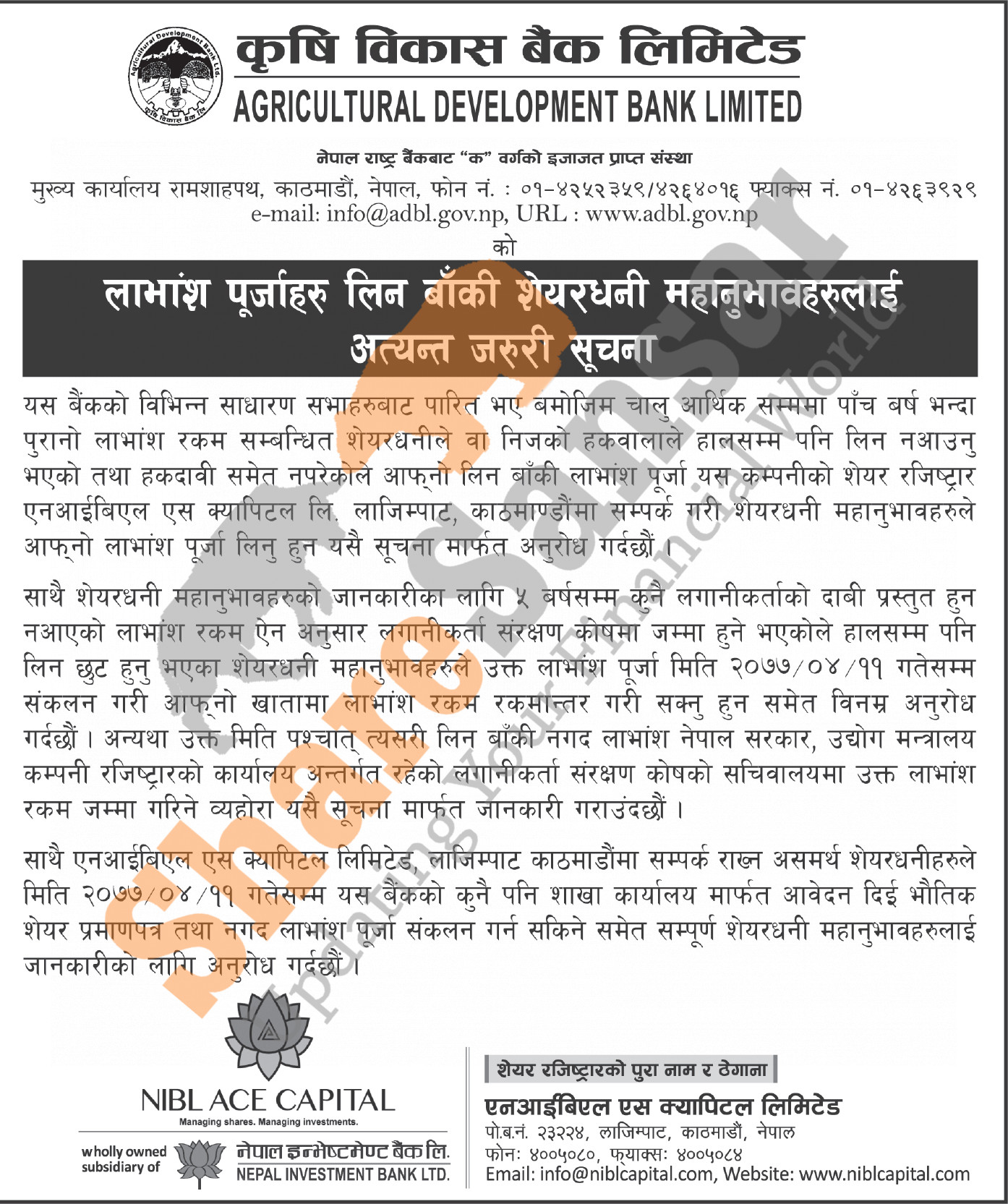 Agricultural Development Bank Limited urges its shareholders to collect uncollected due dividends.