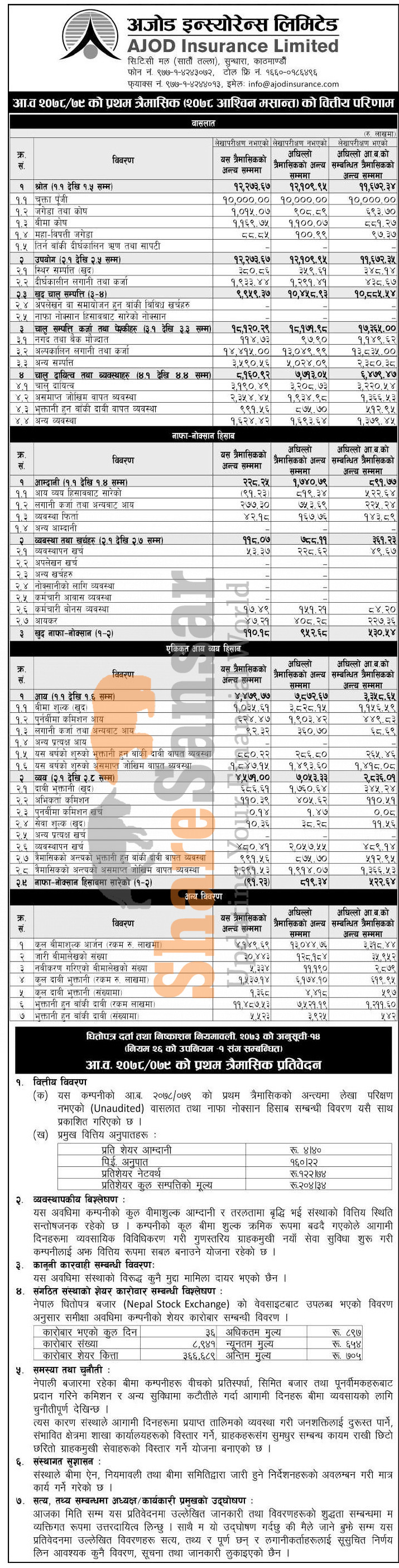 AJOD Insurance Limited has posted a net profit of Rs 11.01 million and published its 1st quarter company analysis of the fiscal year 2078/79.