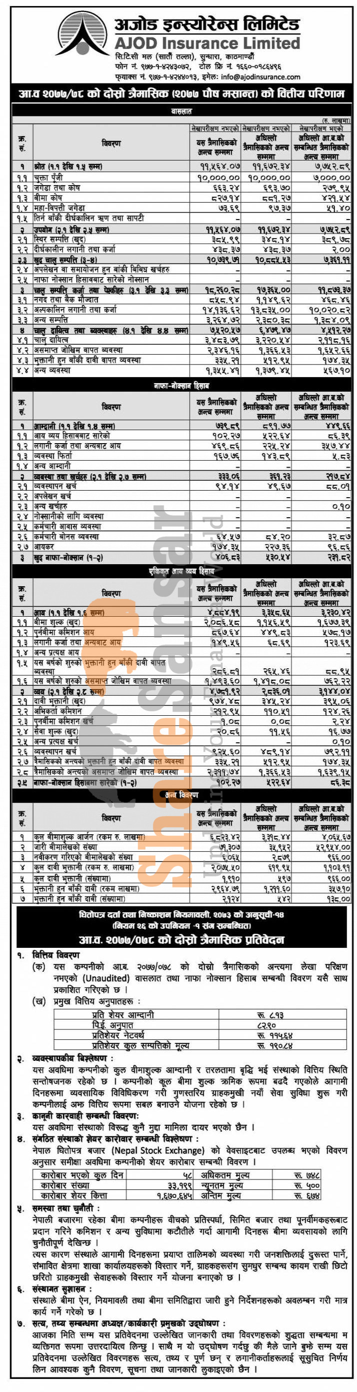 Ajod Insurance Limited has posted a net profit of Rs 40.68 million and published its 2nd quarter company analysis of the fiscal year 2077/78.