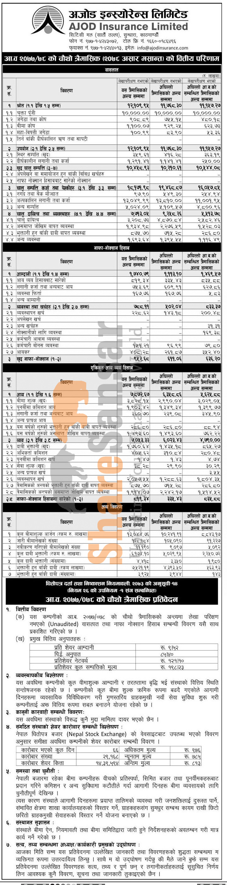 AJOD Insurance Limited has posted a net profit of Rs 95.26 million and published its 4th quarter company analysis of the fiscal year 2077/78.