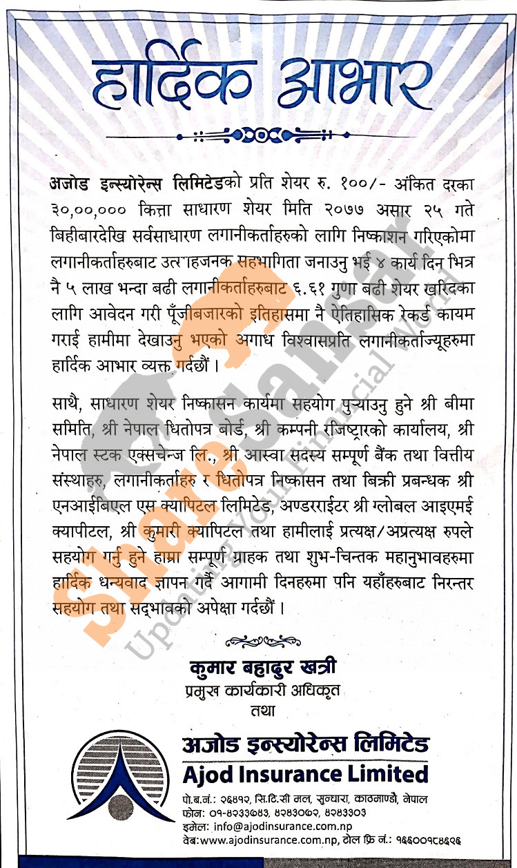 Ajod Insurance Limited has thanks all its stakeholders for successful subscription of its recently issued IPO shares.