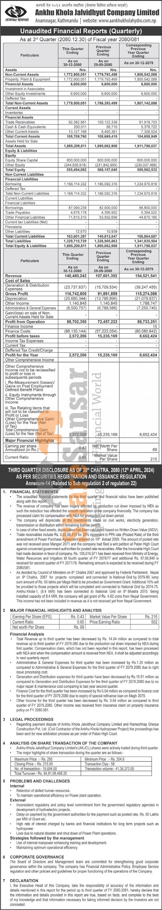 Ankhukhola Jalvidhyut Company Limited has posted a net profit of 2.57 million and published its 3rd quarter company analysis of the fiscal year 2080/81.