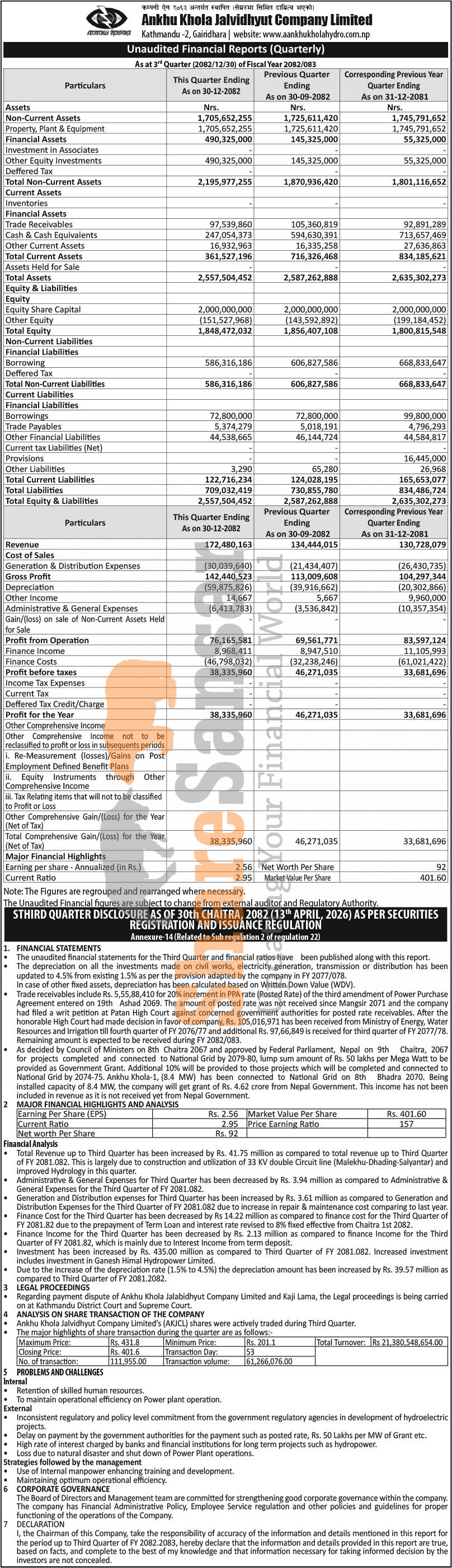 Ankhukhola Jalvidhyut Company Limited has posted a net profit of 38.33 million and published its 3rd quarter company analysis of the fiscal year 2082/83.