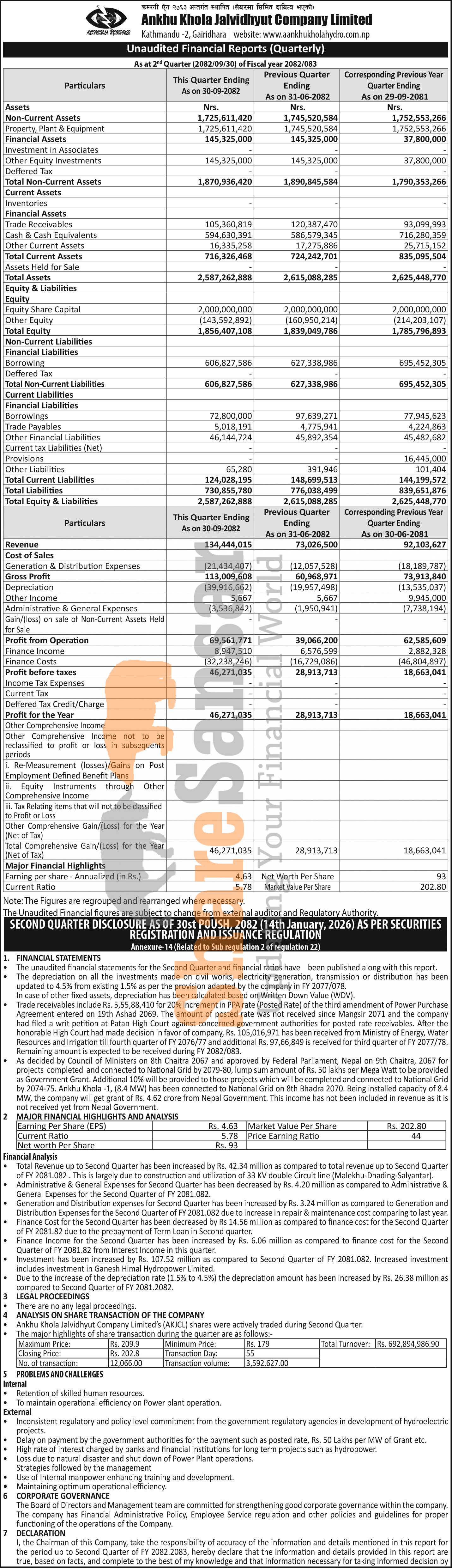 Ankhukhola Jalvidhyut Company Limited has posted a net profit of 46.27 million and published its 2nd quarter company analysis of the fiscal year 2082/83.
