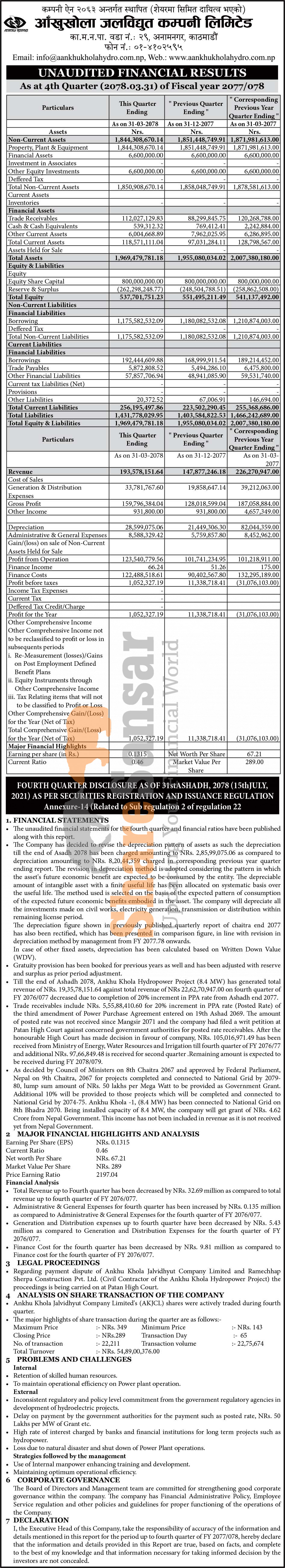 Ankhukhola Jalvidhyut Company Limited has posted a net profit of Rs 1.05 million and published its 4th quarter company analysis of the fiscal year 2077/78.