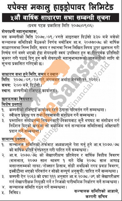 Apex Makalu Hydropower Limited has announced its 5th AGM going to be held on 27th Poush, 2078.