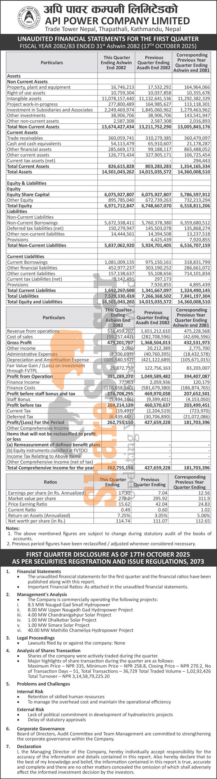 Api Power Company Limited has posted a net profit of Rs 262.75 million and published its 1st quarter company analysis of the fiscal year 2082/83.