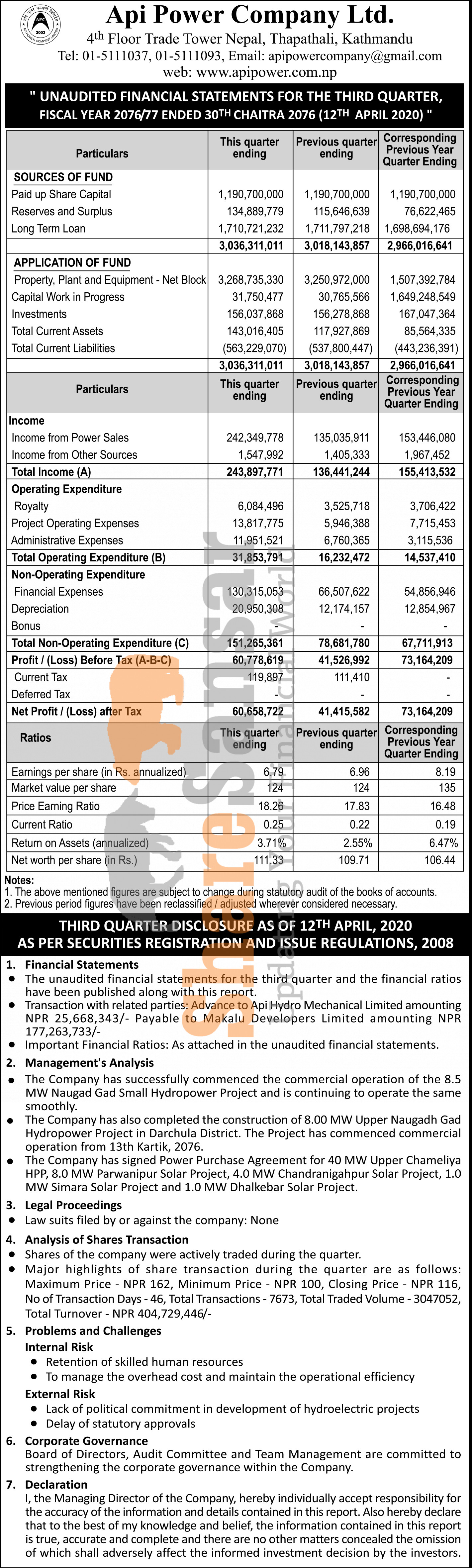 Api Power Company Limited has posted a net profit of Rs 60.65 million and published its 3rd quarter company analysis of the fiscal year 2076/77.