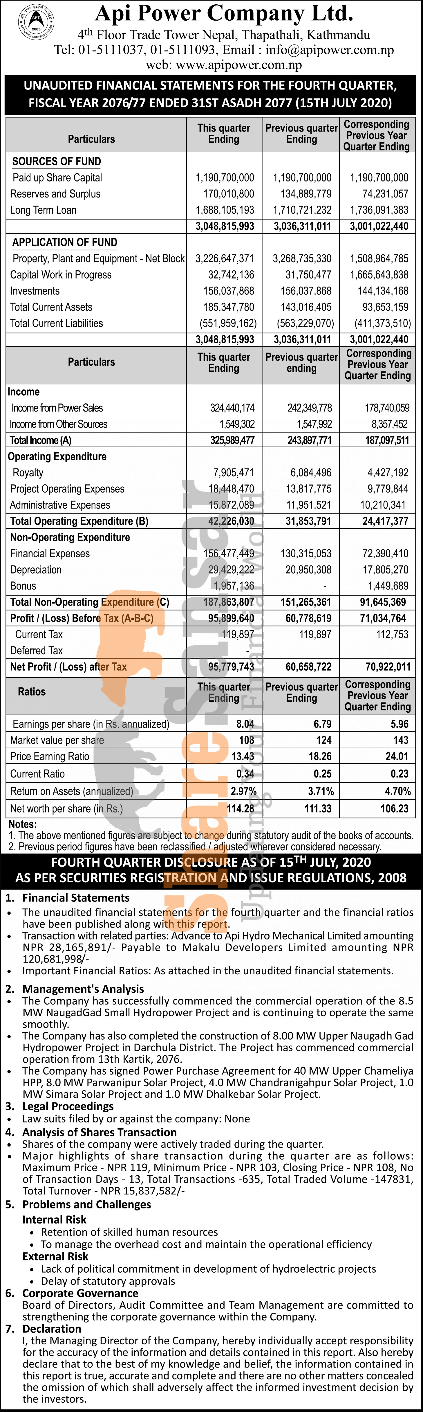 Api Power Company Limited has posted a net profit of Rs 95.77 million and published its 4th quarter company analysis of the fiscal year 2076/77.