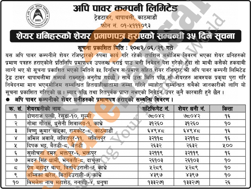 Api Power Company Limited has published a notice regarding a claim for lost share certificates.