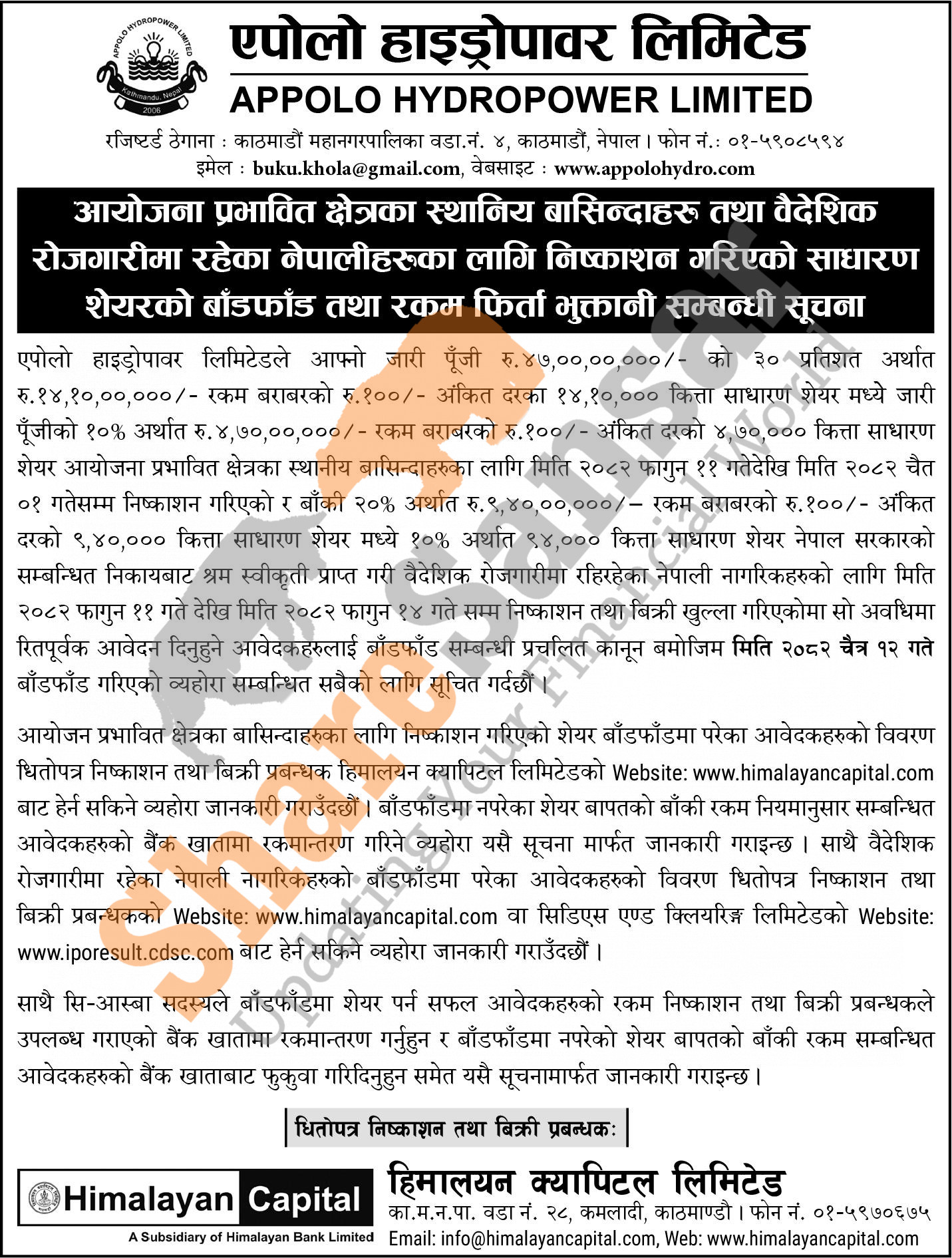 Appolo Hydropower Limited has allotted its 4,70,000 units IPO shares to the project-affected locals of Okhaldhunga, Solukhumbhu and Ramechhap District and 94,000 units IPO Shares to Foreign Nepalese Employees on 12th Chaitra, 2082.