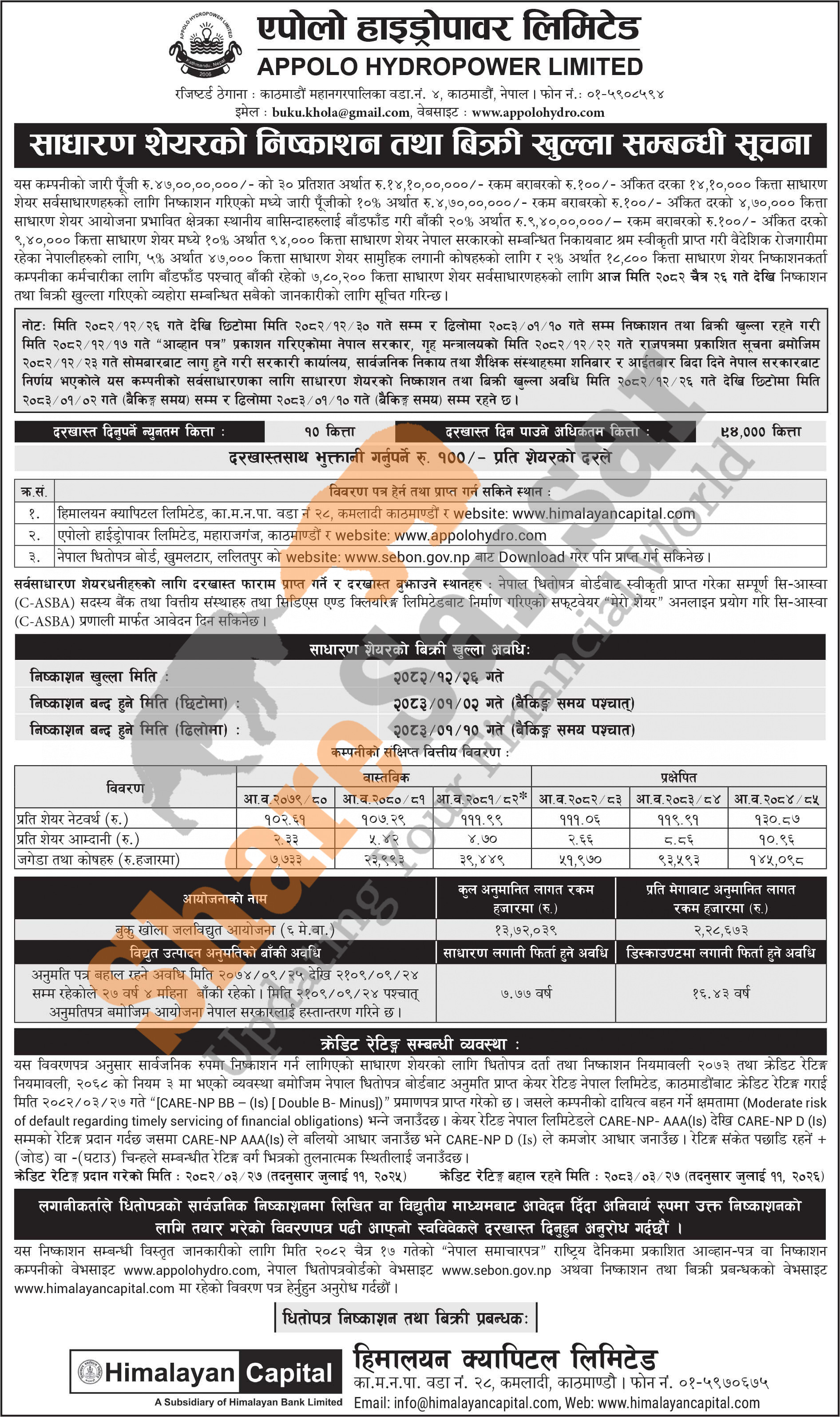 Appolo Hydropower Limited is opening its 7,80,200 units IPO shares to the general public from today (26th Chaitra, 2082).