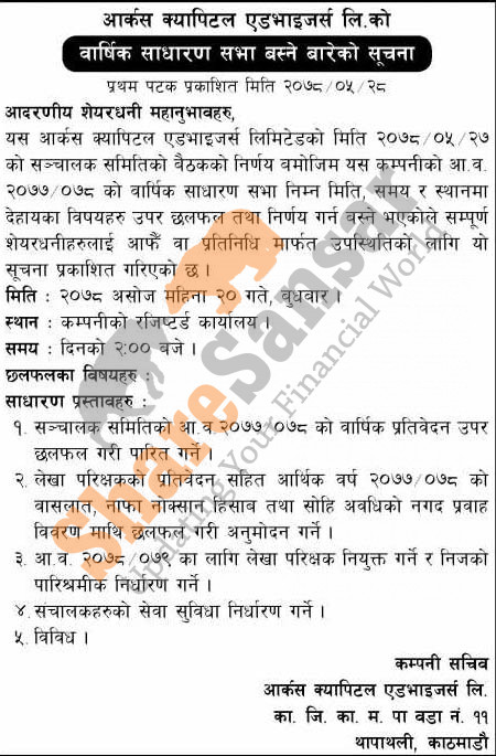 Arks Capital Advisors Limited has announced its Annual General Meeting going to be held on 20th Ashwin, 2078.