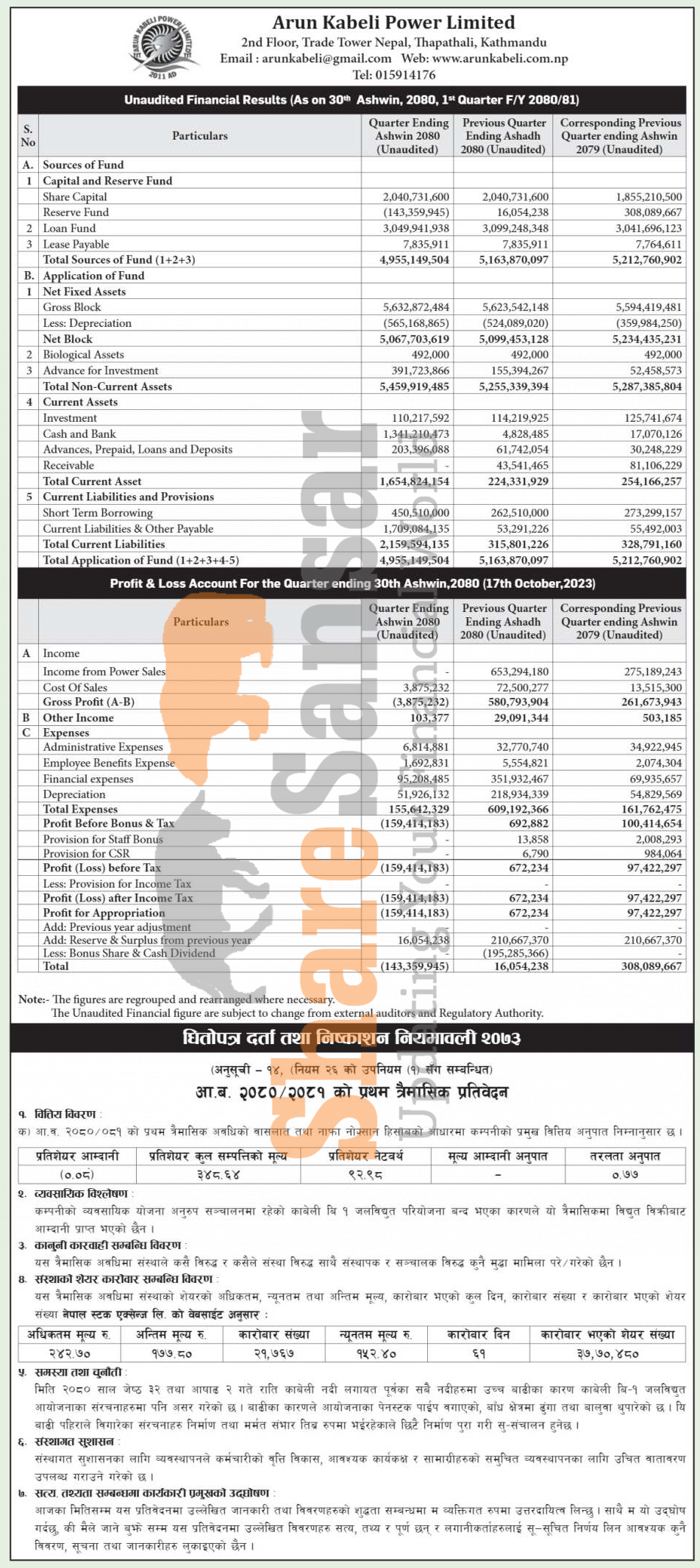 Arun Kabeli Power Limited has posted a net loss of Rs 159.41 million during the 1st quarter of the fiscal year 2080/81.