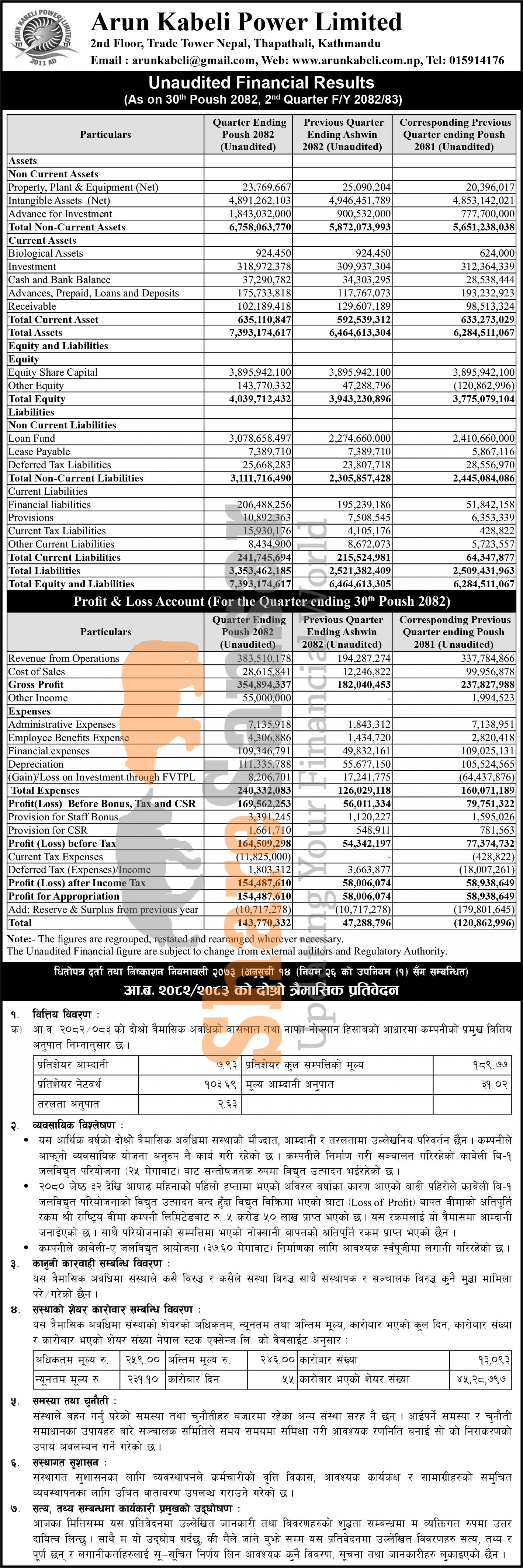 Arun Kabeli Power Limited has posted a net profit of Rs 154.48 million and published its 2nd quarter company analysis of the fiscal year 2082/83.