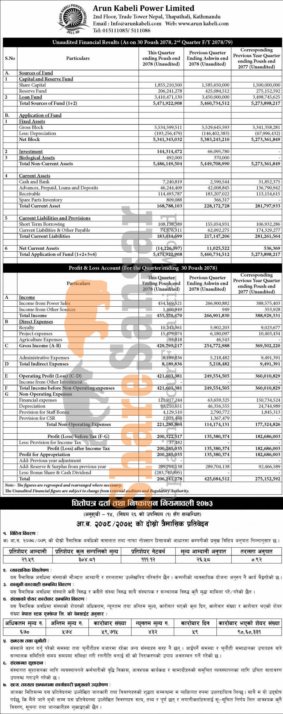 Arun Kabeli Power Limited has posted a net profit of Rs 200.28 million and published its 2nd quarter company analysis of the fiscal year 2078/79.
