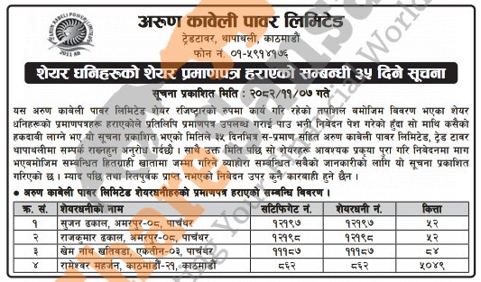 Arun Kabeli Power Limited has published a notice regarding a claim for lost share certificates.