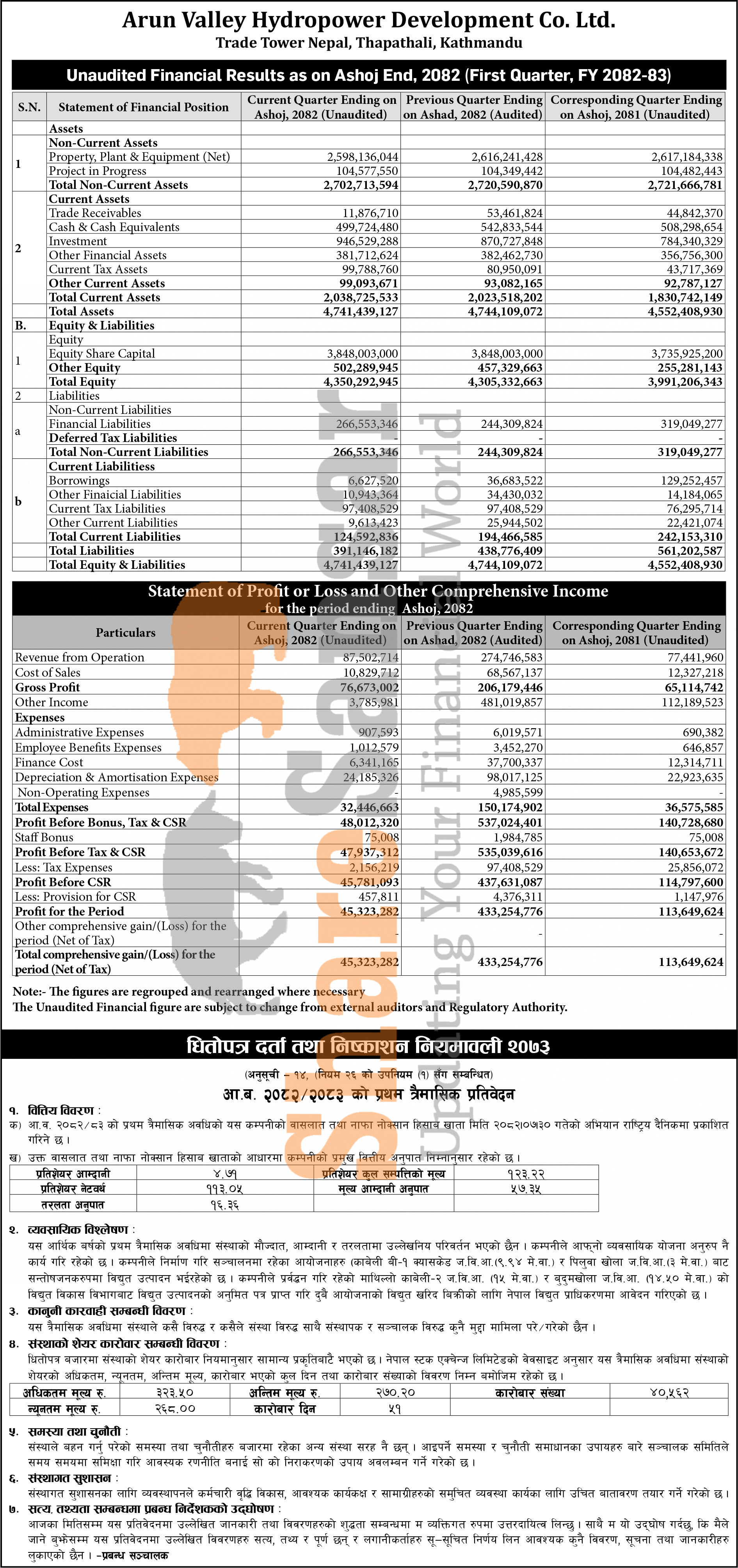 Arun Valley Hydropower Development Company Limited has posted a net profit of Rs 45.32 million and published its 1st quarter company analysis of the fiscal year 2082/83.