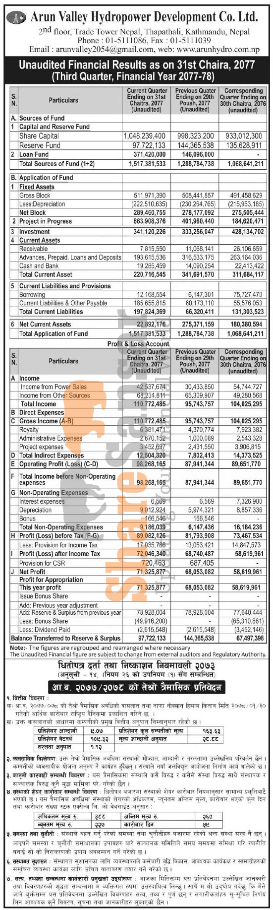 Arun Valley Hydropower Development Company Limited has posted a net profit of Rs 71.32 million and published its 3rd quarter company analysis of the fiscal year 2077/78.