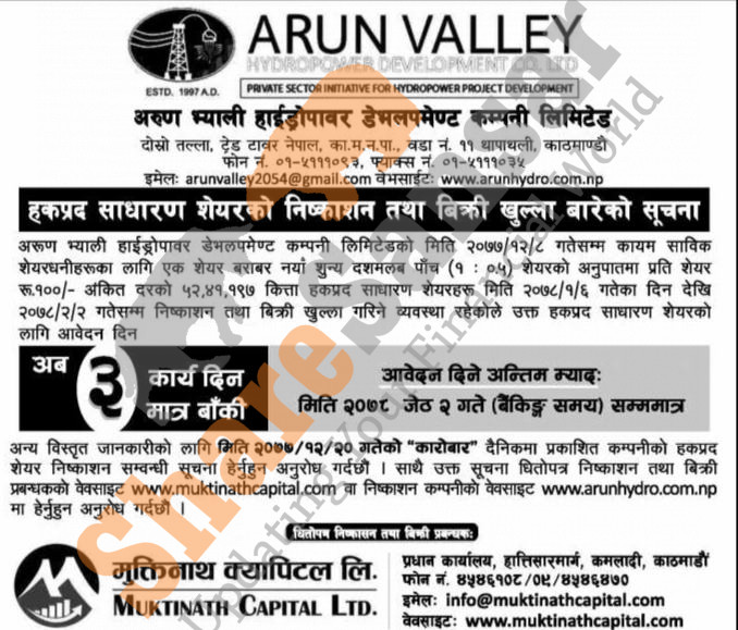 Arun Valley Hydropower Development Company Limited has published a notice regarding 3 days remaining for its ongoing 1:0.5 right share issue.