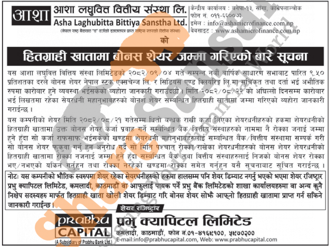 Asha Laghubitta Bittiya Sanstha Limited has distributed 9.50% bonus share directly to DEMAT accounts of its shareholders.
