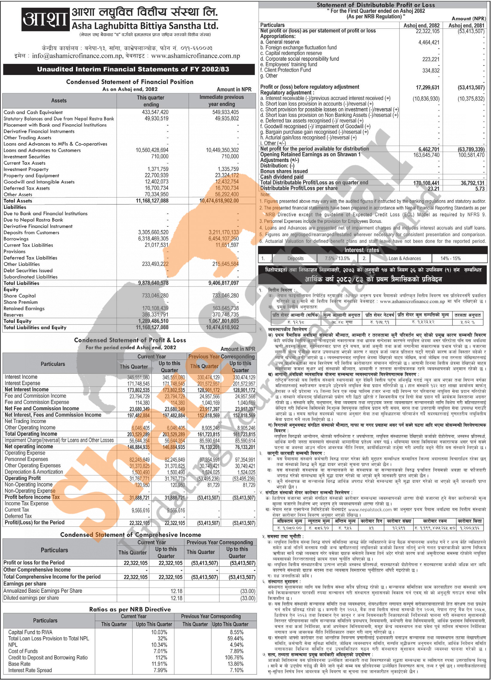 Asha Laghubitta Bittiya Sanstha Limited has posted a net profit of Rs 22.32 million and published its 1st quarter company analysis of the fiscal year 2082/83.