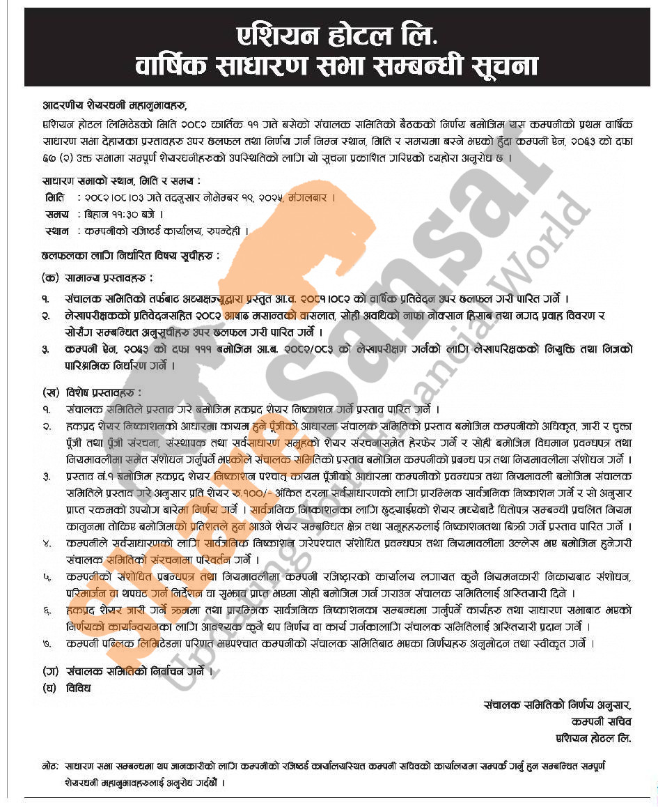 Asian Hotel Limited has announced its 1st AGM going to be held on 3rd Mangsir, 2082.