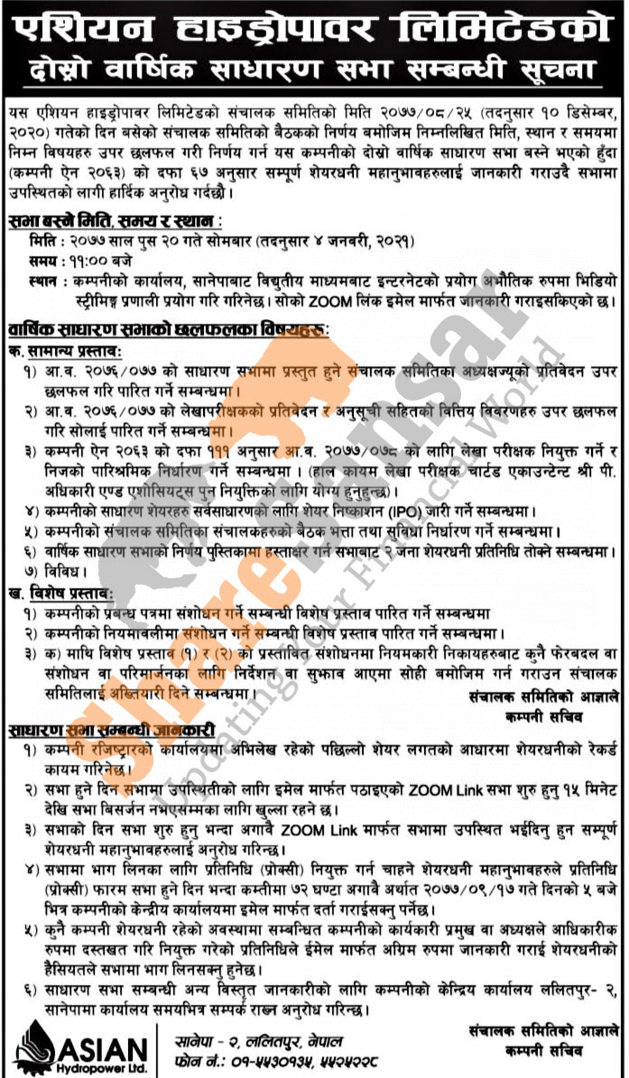 Asian Hydropower Limited has announced its 2nd AGM going to be held on 20th Poush, 2077.