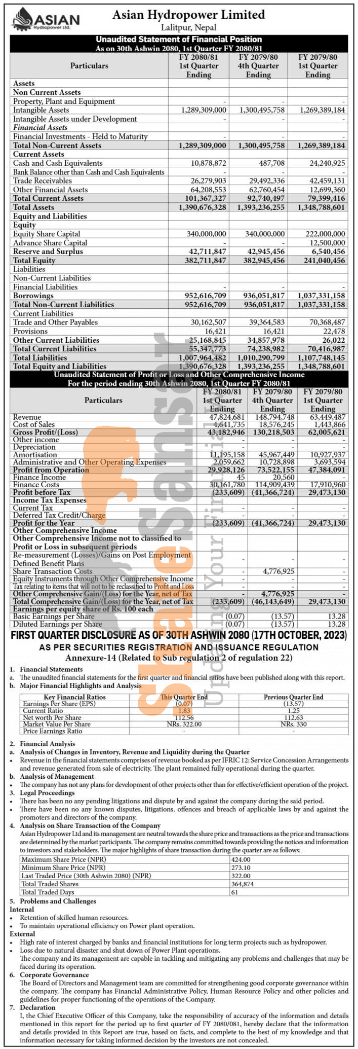 Asian Hydropower Limited has posted a net loss of Rs 0.23 million and published its 1st quarter company analysis of the fiscal year 2080/81.