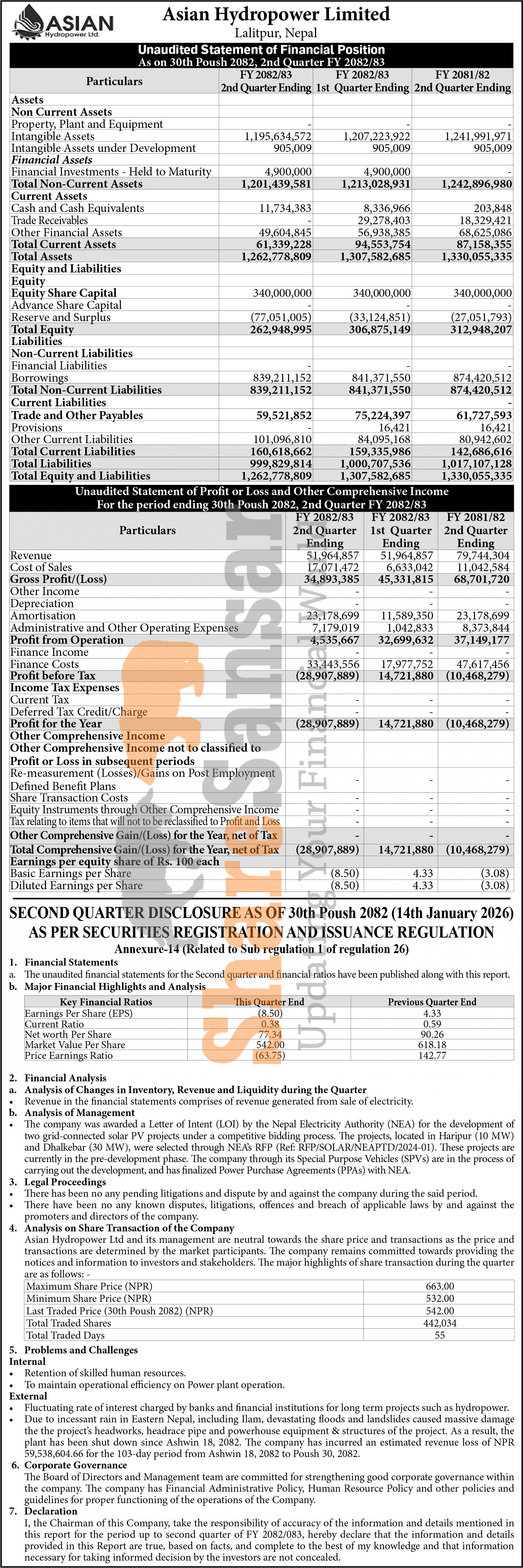 Asian Hydropower Limited has posted a net loss of Rs 28.90 million and published its 2nd quarter company analysis of the fiscal year 2082/83.